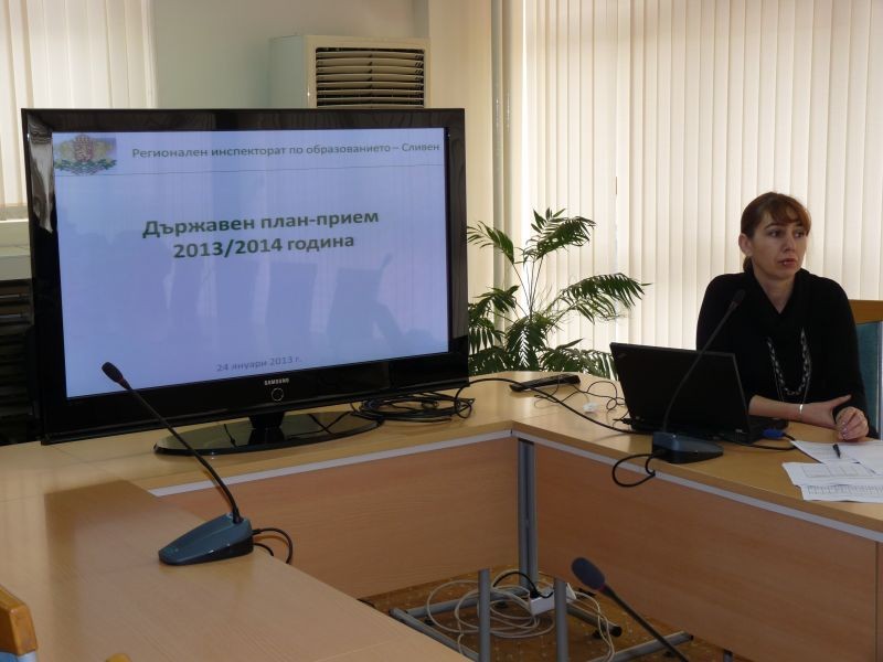 Г-н Кавръков даде думата на г-жа Паскалева – старши експерт по професионално образование в РИО – Сливен, която от своя страна представи мрежата от институции, осъществяващи професионално образование и обучение в област Сливен, кратък анализ на реализирания прием през учебната 2012/2013 година и предложението за държавен план-прием през учебната 2013/2014 година.